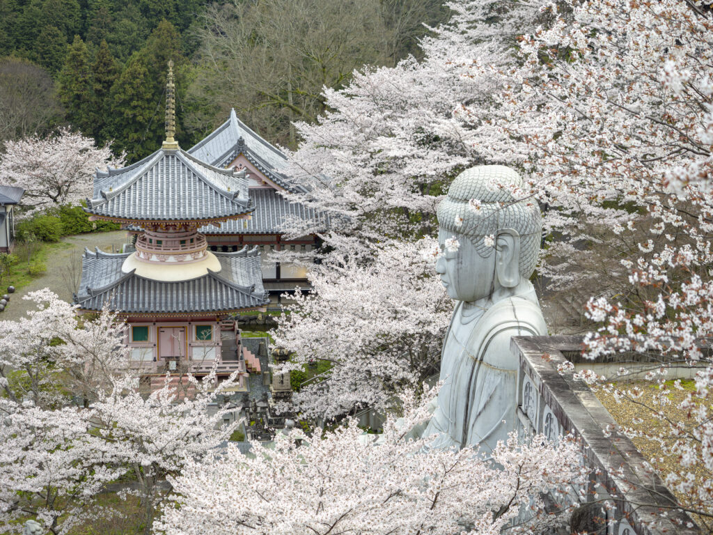 壺阪寺:桜と大仏が織りなす幻想的な景観で知られています。特に桜越しに望む壺阪大仏の雄大な姿は圧巻で多くの参拝者を魅了します。目の観音様として信仰を集める霊場でもあり花と祈りが調和する春の壺阪寺は心を癒やす奈良屈指の花の名所です。 -