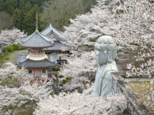壺阪寺:桜と大仏が織りなす幻想的な景観で知られています。特に桜越しに望む壺阪大仏の雄大な姿は圧巻で多くの参拝者を魅了します。目の観音様として信仰を集める霊場でもあり花と祈りが調和する春の壺阪寺は心を癒やす奈良屈指の花の名所です。-