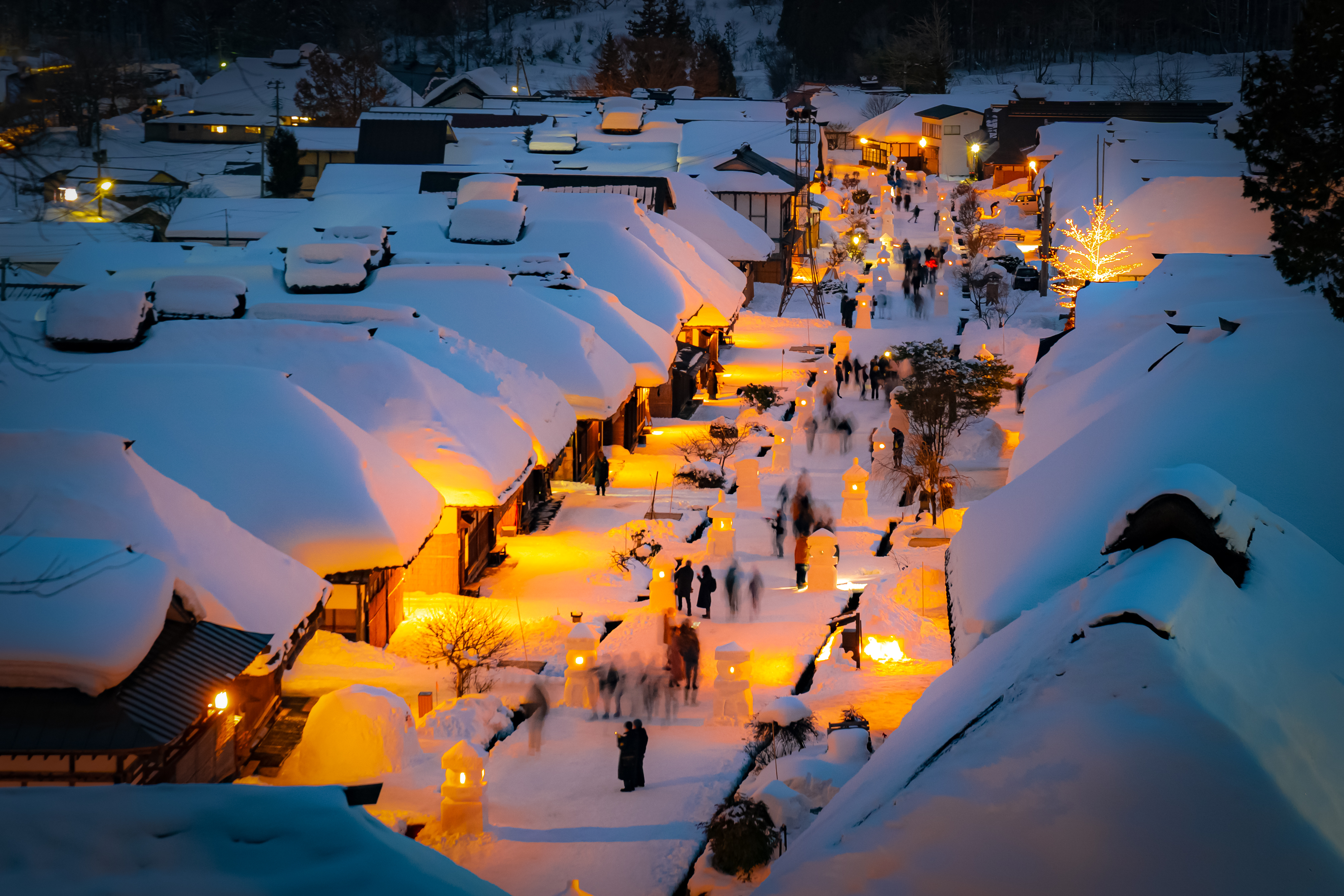 ①横須賀(09:00)=<車中弁当の昼食>=大内宿雪まつり(保存地区に指定された茅葺き屋根の街並みが雪に包まれ、幻想的な冬景色が広がります。夜には雪灯篭に蝋燭が灯り、御神火戴火の神 事や冬の夜空を彩る打ち上げ花火などお楽しみください。/16:00~18:00)=芦ノ牧温泉(18:30頃)