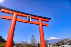 北口本宮浅間神社:登山道の起点として古くから崇敬されてきた歴史ある神社です。景行天皇40年の日本武尊の遥拝が創建にまつわる伝承をもち主祭神には木花開耶姫命・彦火瓊々杵尊・大山祇神を祀っています。朱色の大鳥居や苔むす石灯籠、樹齢1,000年を超える御神木など荘厳な雰囲気が漂います。